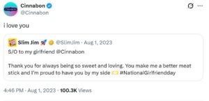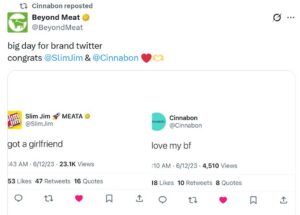 If you were on X during the height of brand banter a few years ago, you may remember an unlikely relationship unfolding in real time: Cinnabon and Slim Jim flirting, escalating and eventually “getting married” on the internet.