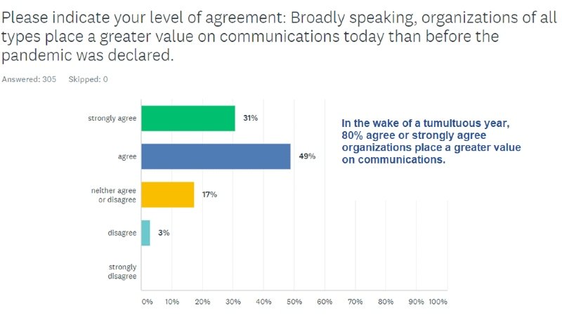 The fourth annual survey polled 300 communications professionals and found in the wake of a tumultuous year, 80% “agree” or “strongly agree” organizations now place a greater value on communications.