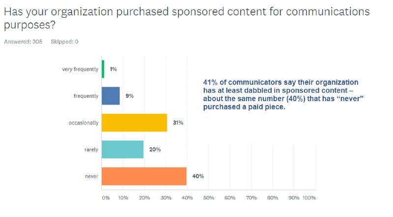 - Credibility of sponsored content. Sixty-two percent say sponsored content, like posts from the Forbes Communications Council, can be credible some of the time, depending on the source. Forty-one percent of communicators say their organization has at least dabbled in sponsored content – about the same number (40%) that has “never” purchased a paid piece.